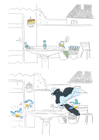 Sticking with the theme of birds, I pursued a project which was an advancement on one that I had researched over summer - my garden birds info zine! S and I discussed anthropomorphising the gardens birds and creating informative comic strips in order to teach my target audience of kids about the birds they would find around them. At the same time, I also wanted to decrease my paper usage as roughing out ideas can quickly lead to single-handed deforestation. So keeping the chickens in mind, I began sketching on the computer!
